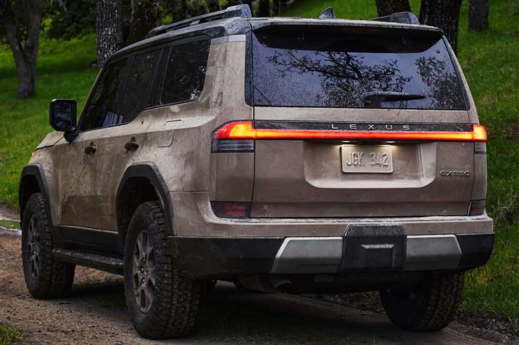 The rear of the car displays the signature Lexus L-shaped light bar with high-set lamps, making the GX easier to spot when driving off-road in convoy.