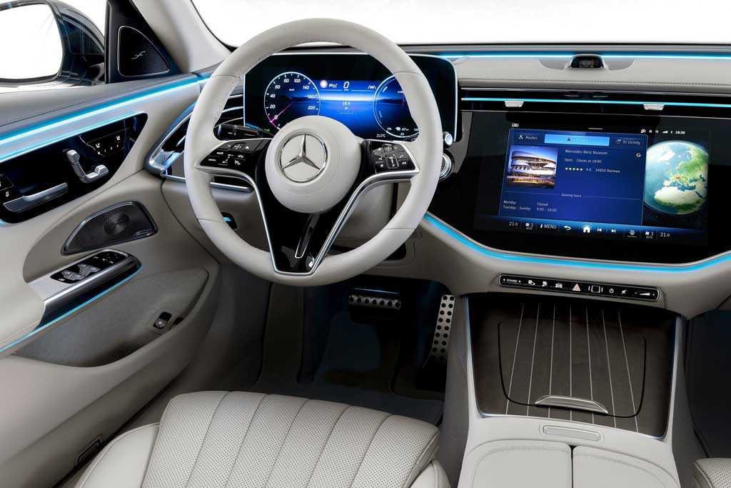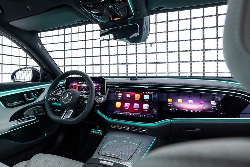 Салон Mercedes-Benz E-Class W214 встречает новой передней панелью, оформление которой выполнено в стиле электрических моделей EQE и EQS. Здесь электронный щиток приборов в виде отдельно стоящего 12,3-дюймового экрана без козырька, а всю центральную консоль занимает огромный дисплей мультимедийной системы на 14,4″. Опционально предложен третий монитор (на 12,3″), расположенный перед передним пассажиром.