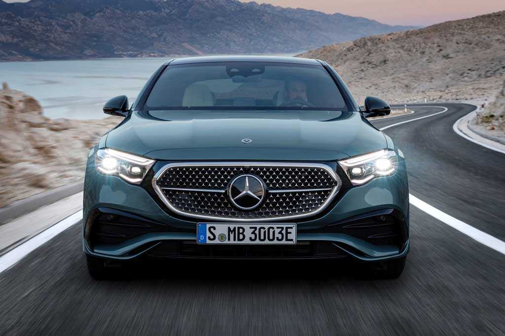 Спереди Мерседес-Бенц Е-класса 2024 года получил увеличенную в размерах решетку радиатора (опционально можно оснастить подсветкой) с толстой хромированной окантовкой. Для модели предложена два варианта: версия «Classic» имеет более традиционный рисунок решетки с тремя горизонтальными ребрами и фирменной звездой на капоте.