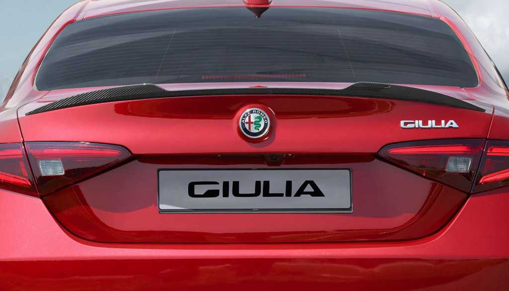 На корме второго поколения Альфа Ромео Джулия присутствует немного закругленная крышка багажного отделения. Последняя обладает достаточно солидным карбоновым спойлером. Задняя часть дополнительно выделяется стильной оптикой, получившей грозное оформление. Дизайнеры и инженеры смогли создать отличный задний бампер. По его сторонам разнесены по два крупных патрубка выпускной системы с каждой стороны. Чего только стоит крупный диффузор. Выглядит это все превосходно.