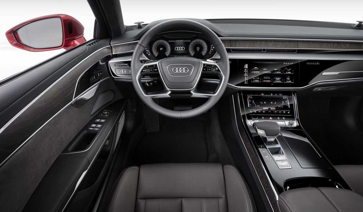 Салон новой Audi S8 выполнен в стиле последних моделей компании. Тут органично совмещается аристократический стиль и современные технологии. Перед водителем располагается первоклассный 4-спицевый мультируль, а также крупная цифровая панель приборов, представленная 12,3-дюймовым ЖК-дисплеем.