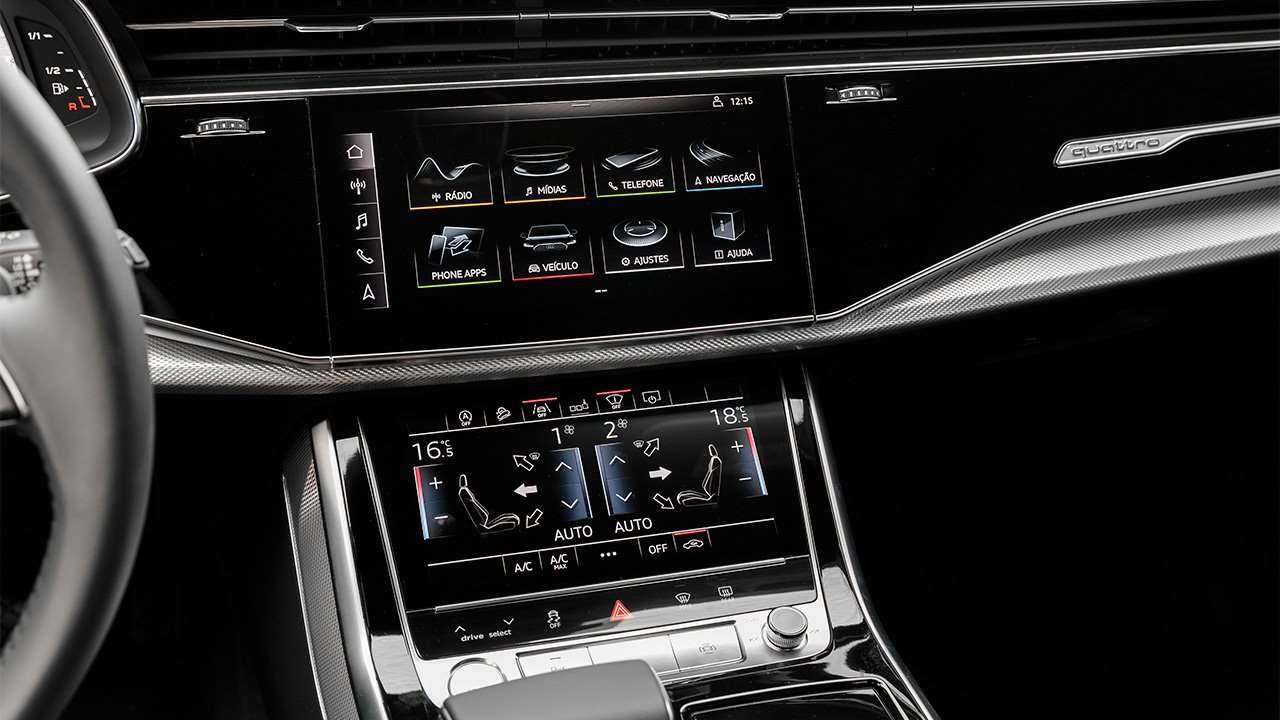 Панель торпедо все покрыта вставкой из рояльного лака (или другого материала), плюс образ дополняется контурной подсветкой. Посередине красуется 10,1-дюймовый дисплей мультимедийного комплекса MMI Navigation plus с голосовым управлением. Голосом можно настраивать даже климатическую систему Q8, но до уровня этой системы в Мерседесе далеко. Ниже еще один 8,6-дюймовый дисплей, направленный на настройку раздельного климат-контроля.