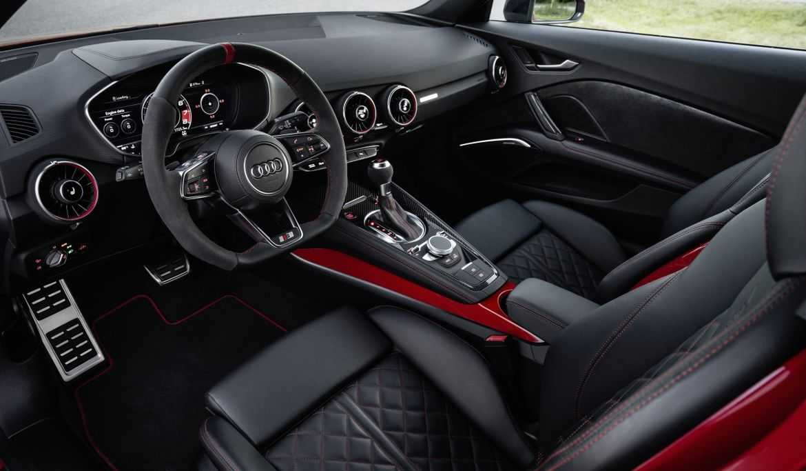 В салоне спорткар Audi отличается от обычных «TT» более спортивным и эргономичным рулем, который улучшен для быстрого вращения на скорости. Ковшеобразные передние кресла обшиты качественной и прочной кожей, в остальном модель повторяет предыдущие – строгий, без излишеств, дизайн с минимальным количеством функциональных клавиш, качественные материалы отделки и отличная сборка как салона, так и кузова.