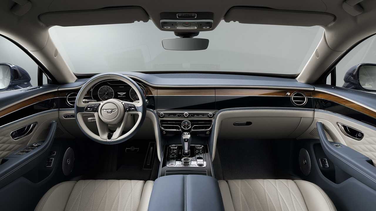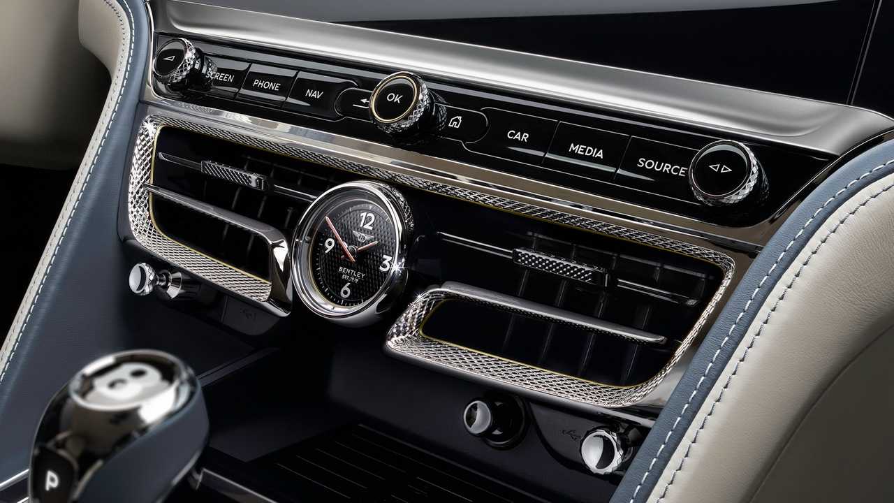 Передняя панель новинки Бентли почти один в один как у купе Continental GT, отличается лишь конфигурация и оформление вентиляционных дефлекторов на центральной консоли. Над самими дефлекторами располагается фирменный поворотный блок с тремя гранями: первая отделана шпоном в цвет панели, на второй находятся три аналоговых циферблата (указатель температуры, компас и хронометр), на третьей прописался 12.3-дюймовый сенсорный дисплей мультимедиа-системы (именно этой стороной поворачивается призма при запуске двигателя кнопкой).