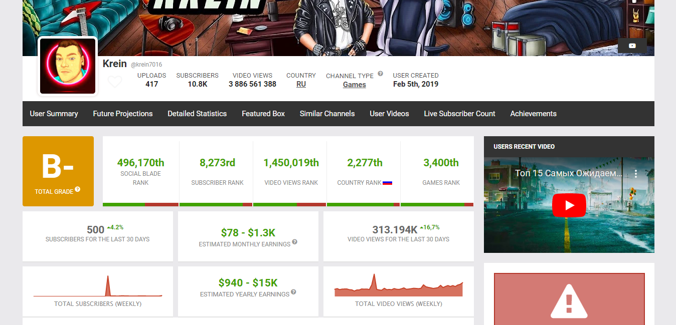 Например, YouTube канал Krein имеет чуть более 10 тысяч подписчиков, однако, ежемесячный доход блогера составляет от 78 до 1,3 тысяч долларов.