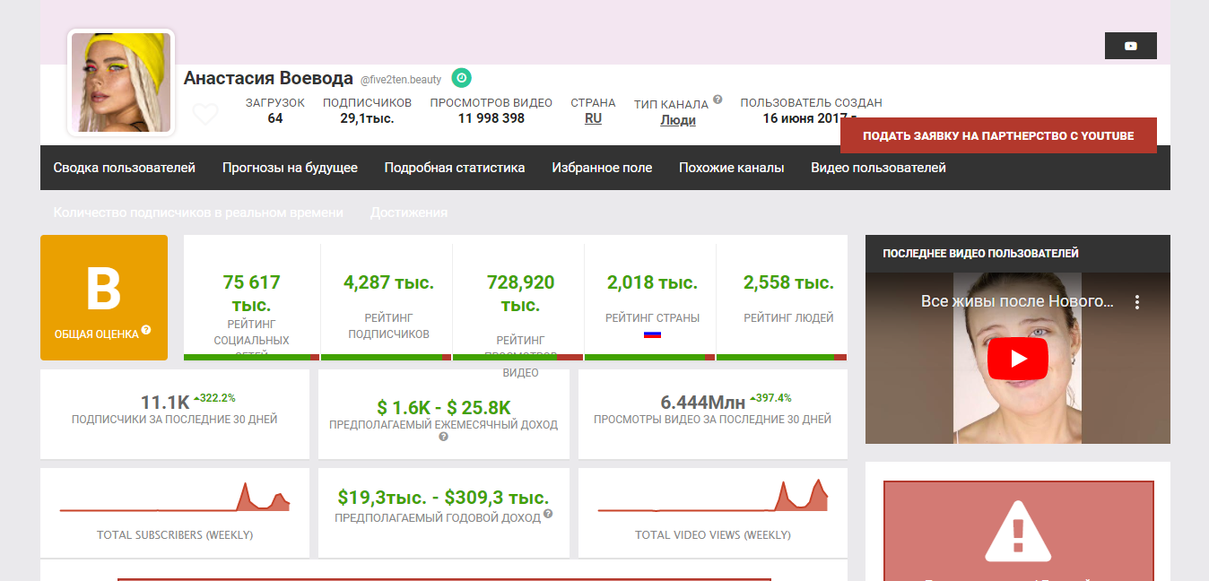 Например, Анастасия Воевода зарабатывает на своем бьюти-блоге в Ютубе от 1,6 тыс. до 25,8 тыс. долларов, имея аудиторию в 29 тысяч подписчиков.