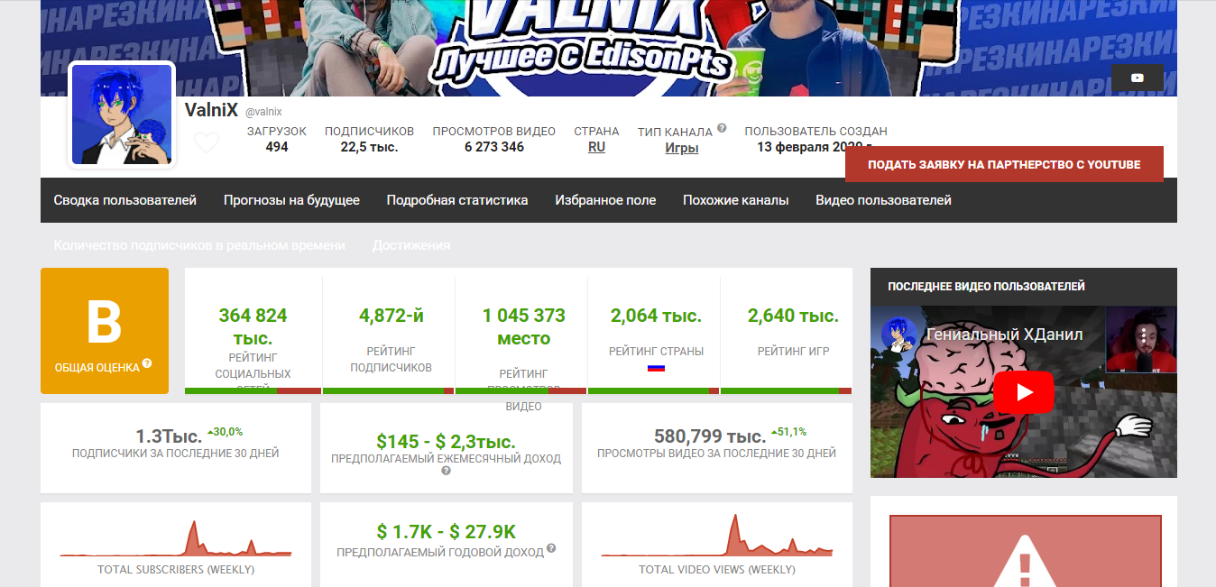 В качестве примера рассмотрим канал ValniX, который имеет аудиторию в 22,5 тысяч подписчиков. По данным сайта Social Blade, ежемесячный доход канала составляет от 145 до 2300 долларов.