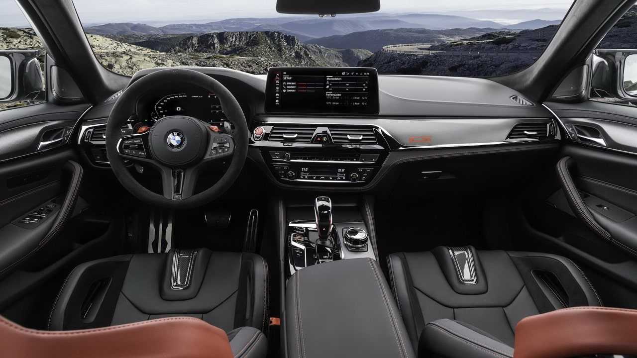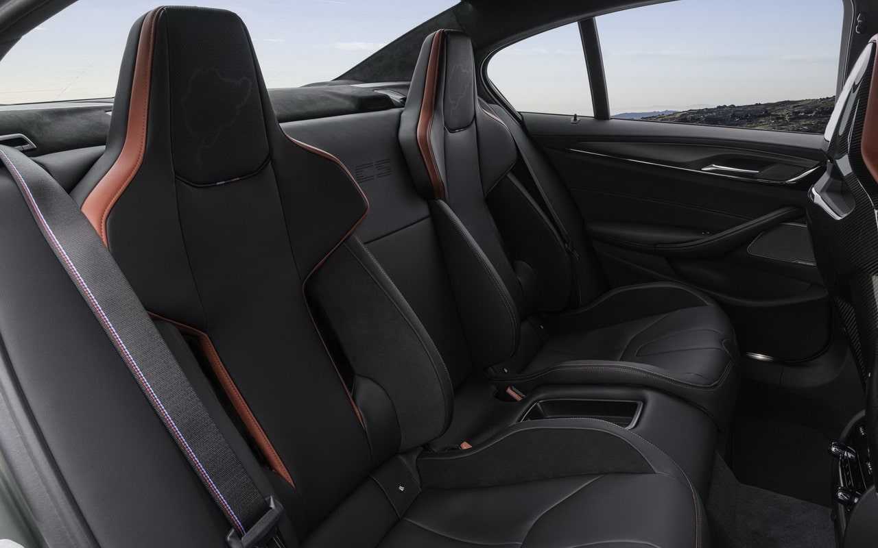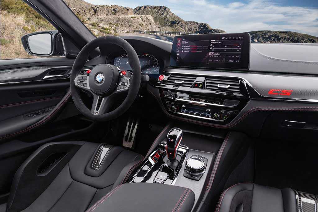 Серьезно выглядит салон BMW M5 CS, вместо удобных спортивных сидений обычного M5 здесь не только легкие карбоновые ковшеобразные сиденья для водителя и переднего пассажира, заднее сиденье также заменено двумя ковшеобразными сиденьями. Центральная консоль, которую нельзя открыть, позволяет сэкономить дополнительный вес. Многочисленные красные детали и значки CS, наконец, указывают, что перед нами силовой лимузин.