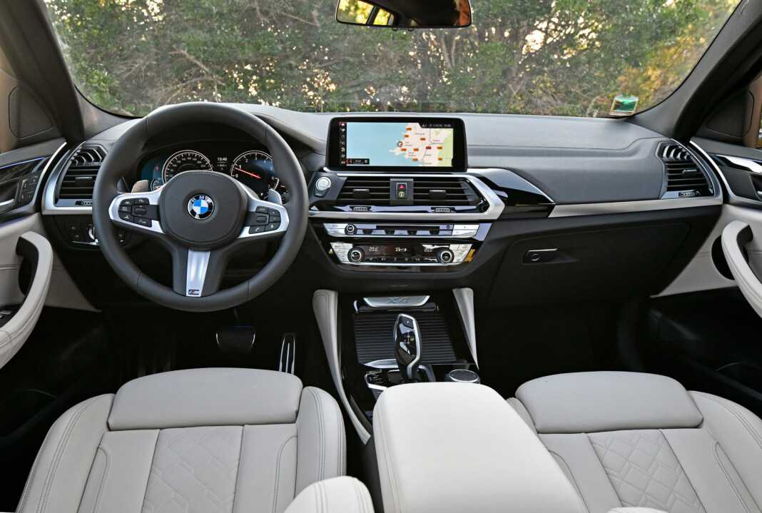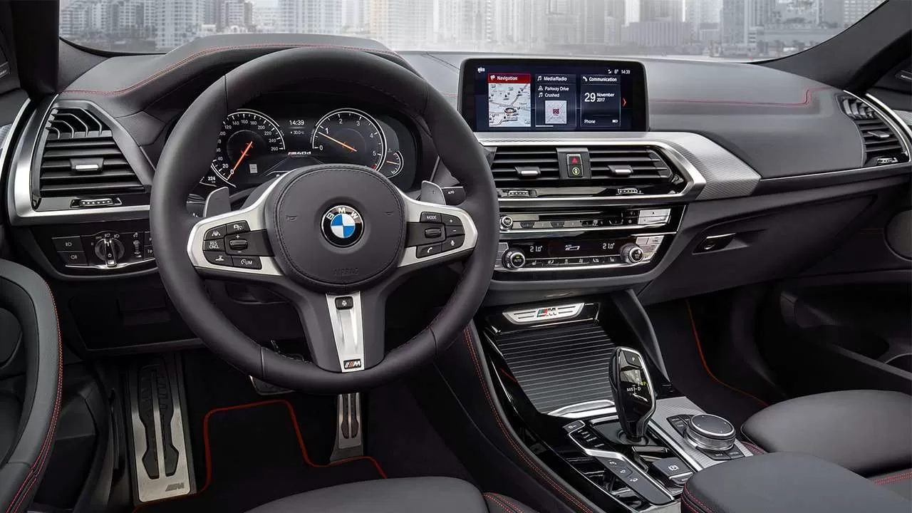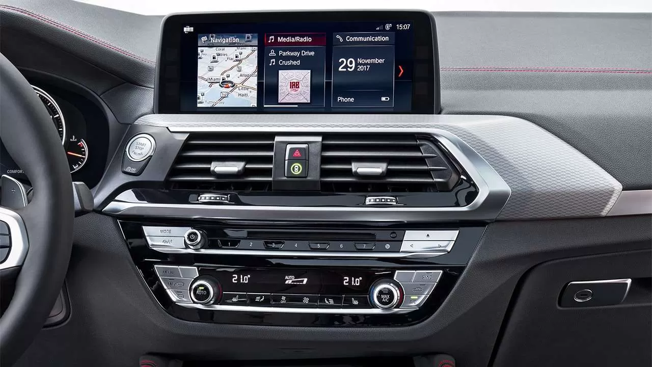 На центральной консоли над вентиляционными дефлекторами установлен сенсорный дисплей мультимедийной системы iDrive. Стандартная комплектация кроссовера BMW X4 G02 предусматривает диагональ экрана 6,5 дюймов, дорогостоящие модификации предлагают 10,25-дюймовый дисплей. Мультимедийная система способна воспринимать голосовое управление, также управлять можно с помощью сенсора.