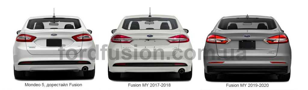 Fusion MY 2019-2020 имеет свои собственные фонари с накладкой между ними (хром теперь только на самих фонарях), свою нижнюю накладку крышки багажника и свой бампер. Бампер 19-го года можно отличить по довольно широкой нижней накладке черного цвета, по бокам же снизу бампер окрашен в цвет кузова.