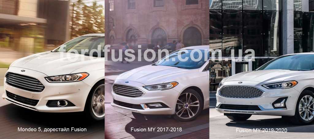 Fusion MY 2017-2018 имеет бамперы и нижнюю накладку крышки багажника как на доресте и Mondeo, однако свои собственные фонари и накладку между ними (появилась хромированная полоса на всю ширину автомобиля).