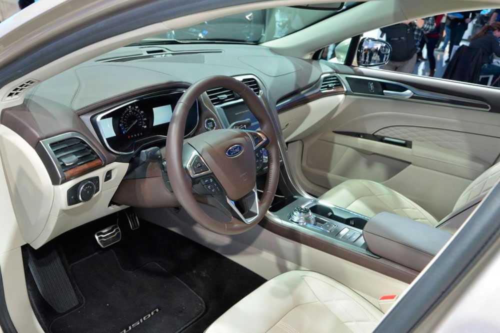 Интерьер радует новыми материалами отделки и физическими кнопками стереосистемы и климата. Основные жалобы владельцев предшественника заключались в неудобстве пользования сенсорными кнопками на торпедо, поэтому производителю пришлось исправить этот недостаток. Мультимедийная система SYNC 3 получила новую прошивку и может без проблем агрегатироваться с смартфоном владельца нового Ford Fusion. Вместо традиционного рычага автоматической коробки переключения передач появилась шайба, с помощью которой теперь включается необходимый режим «автомата».