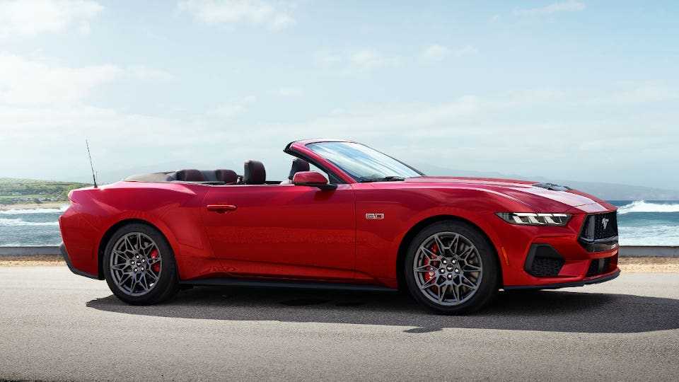 The Mustang convertible’s top continues to fold nearly flush with the bodywork for a clean look when down. Ford