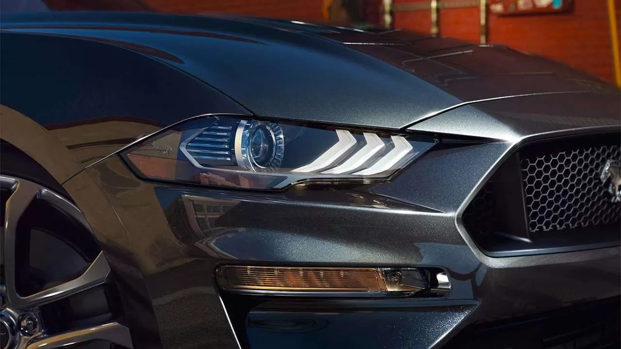Больше всего внимание привлекает передняя оптика, со светодиодным наполнением в виде изогнутых вертикальных полос. Над оптикой Ford Mustang нависает массивный капот с многочисленными выштамповками