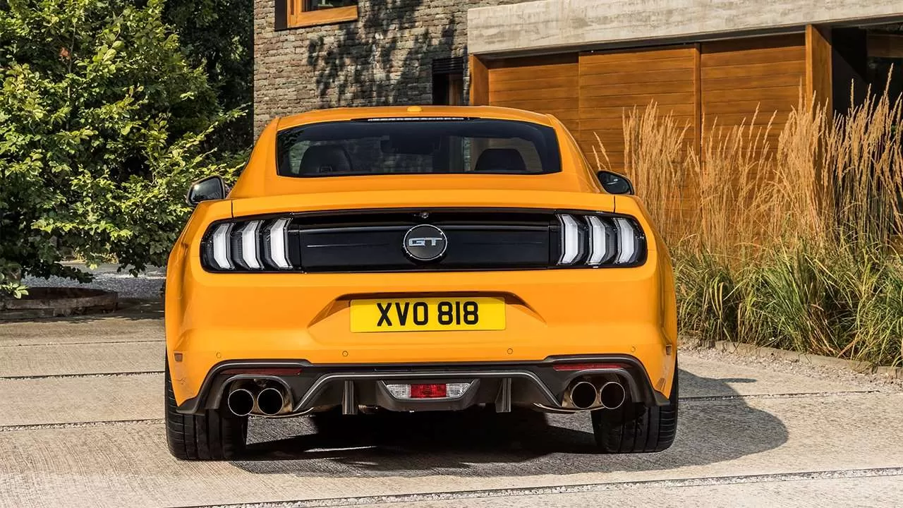 Сзади автомобиль получил строенные светодиодные фонари с вертикальным ориентированием, которые похожи на фонари первого Мустанга, но имеют стилизацию сегодняшнего времени. Над ними возвышается спойлер, который доступен не для всех модификаций, а нижнюю часть украшают одиночные или сдвоенные патрубки выхлопной системы (зависит от модификации).