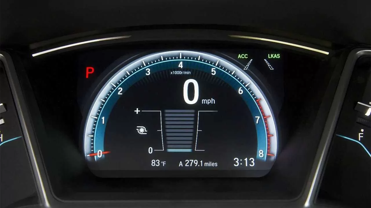 - Приборная панель состоит из трех частей. При этом шкала спидометра и тахометра занимает большую часть панели. На нее выводятся данные с бортового компьютера Хонды Цивика, управлять которыми можно с помощью мультируля. По бокам находятся два небольших дисплея с показателями уровня топлива и температурных датчиков;