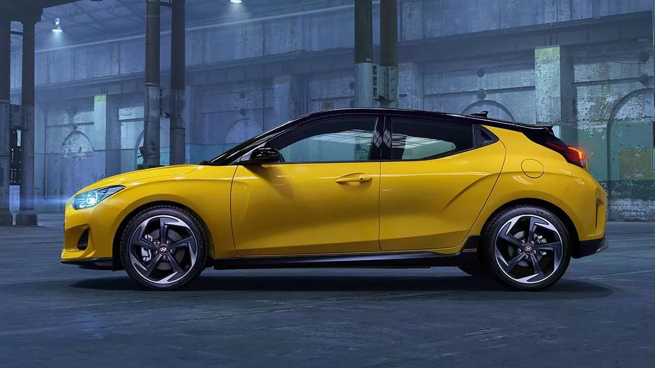 Сбоку осталась спадающая крыша еще с начала основания. Нововведением стали углубления спереди и сзади, напоминающие похожею идею Весты. Нижняя линия над порогом Veloster 2022-2023 более агрессивная, а пороги умеренно раздуты. Хэтчбеку устанавливают 17-дюймовые диски, опционально заменяемые 18-дюймовыми.