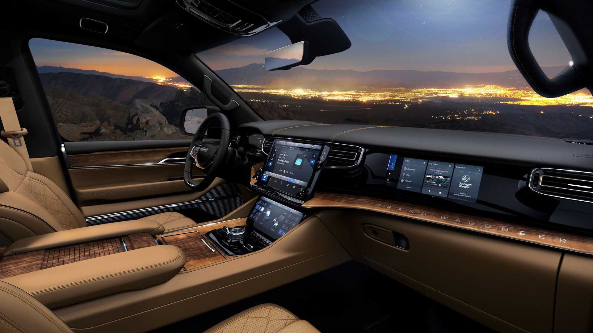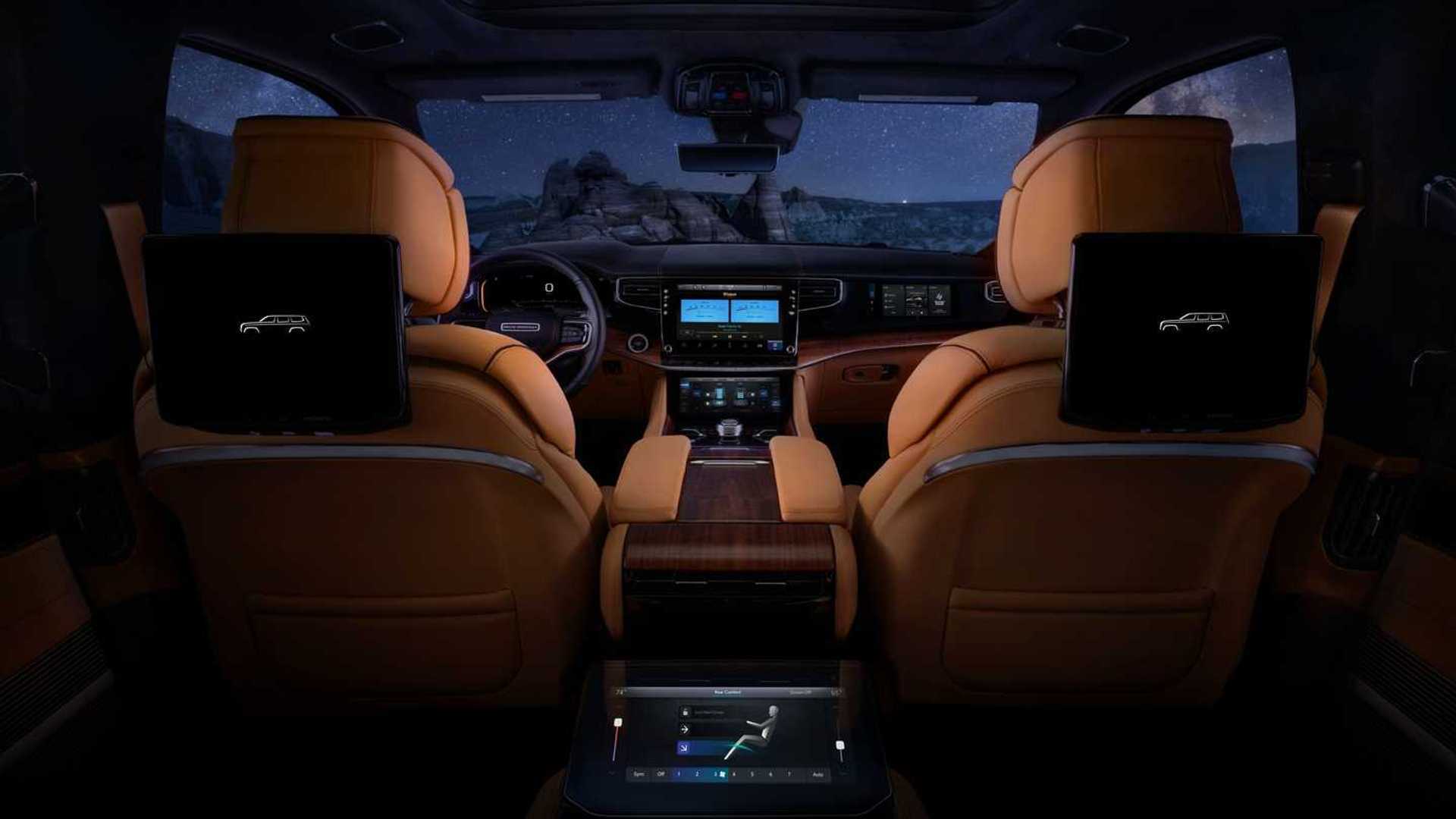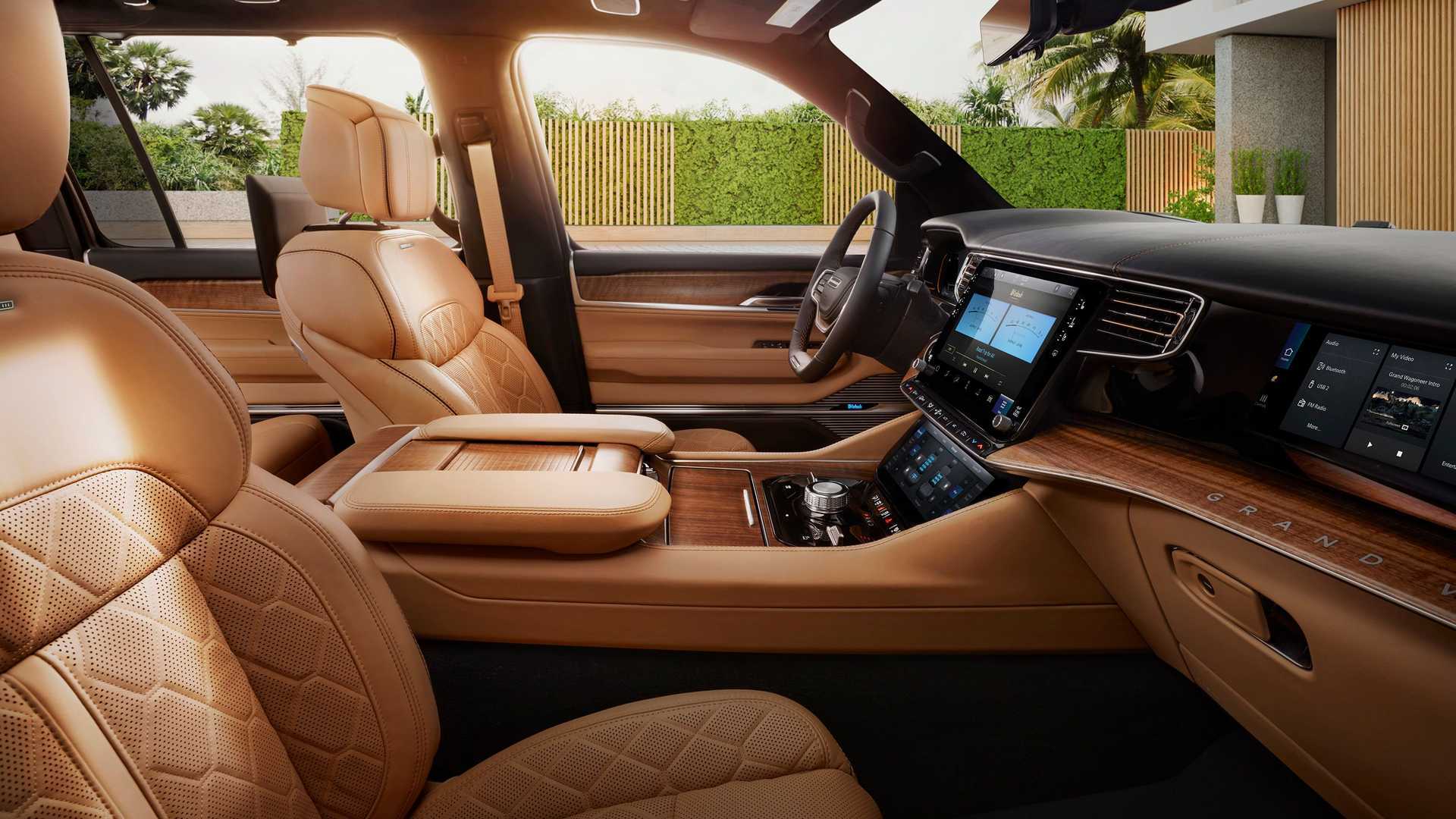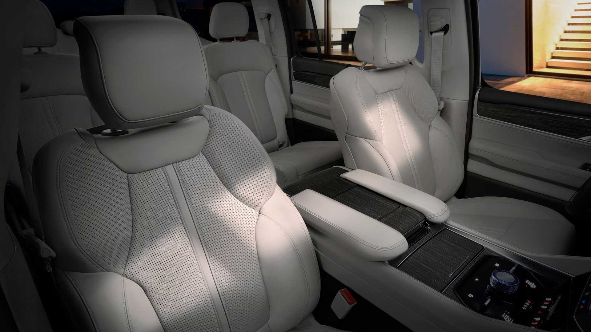 Интерьер салона выглядит дорого: с кожаной обивкой сидений, электроприводом передних кресел, трехзонным климат-контролем. Объем багажного отсека версии Grand Wagoneer L, если считать пространство до нижней кромки боковых стекол, составляет внушительные 1252 литра. Примечательно, что по этому показателю Jeep обходит всех конкурентов.