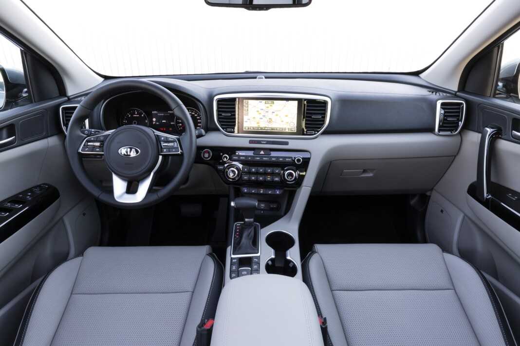 Салон Sportage вмещает пять человек на тканевых сиденьях. Передние сиденья с подогревом, вентиляцией и электроприводом доступны, так же как обшивка из искусственной или натуральной кожи. Отдельно представлен руль с подогревом. Ощущения классовости добавляют доступные хромированные элементы. Модели 2021 стандартно оснащены 8.0-дюймовым сенсорным экраном, Apple CarPlay, Android Auto, аудиосистемой на 6 динамиков, Bluetooth и USB портом. Доступными являются навигационная система, беспроводная зарядка, еще один USB порт, система «Harman Kardon» с 8 динамиками и спутниковое радио. Информационно-развлекательная система отличается простотой использования, предусмотрено немало обычных кнопок, а сенсорный экран быстро и четко реагирует на запросы. Сиденья обоих рядов комфортные и просторные. Позади предусмотрено два полных набора креплений LATCH для детских кресел. Объем багажного отделения составляет 869 литров с разложенными задними сиденьями и 1700 литров со сложенными. Оба показателя меньше, чем в среднем по классу.