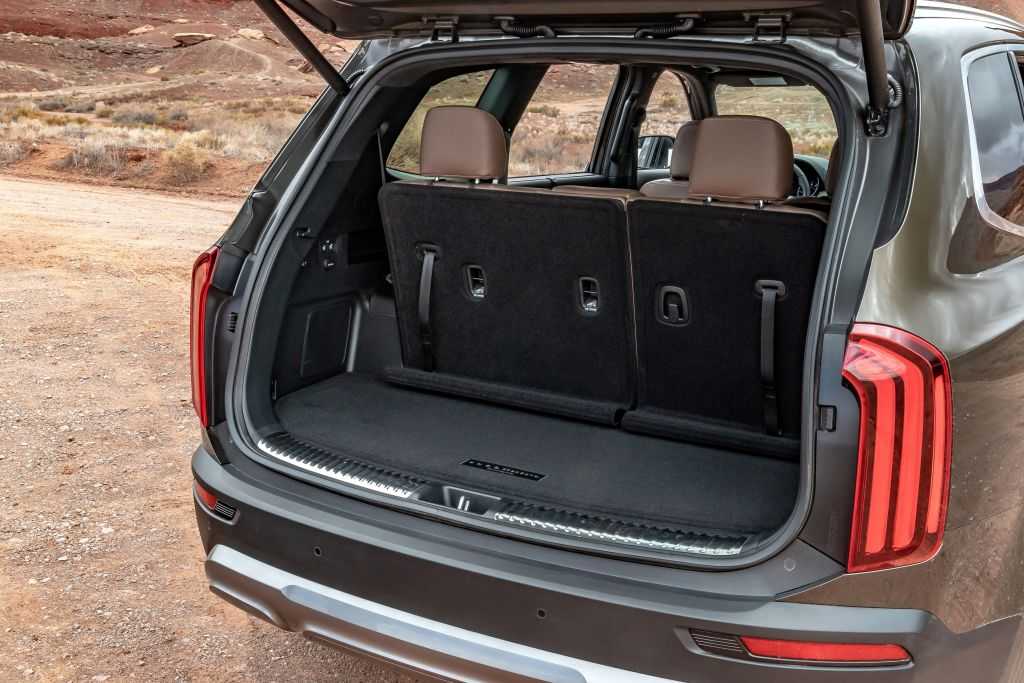 Стоит отметить, что транспортное средство Kia Telluride 2021 может похвастаться наличием переднего или полного привода в зависимости от подобранной автолюбителем версии. Модель имеет 7- или 8-местный салон и просторный багажник на 594 литра. В пятиместном исполнении багажник внедорожника сможет вместить до 1 300 л. Если полностью убрать задние пассажирские сидения, то можно будет разместить в багажнике модели до 2 400 л груза.