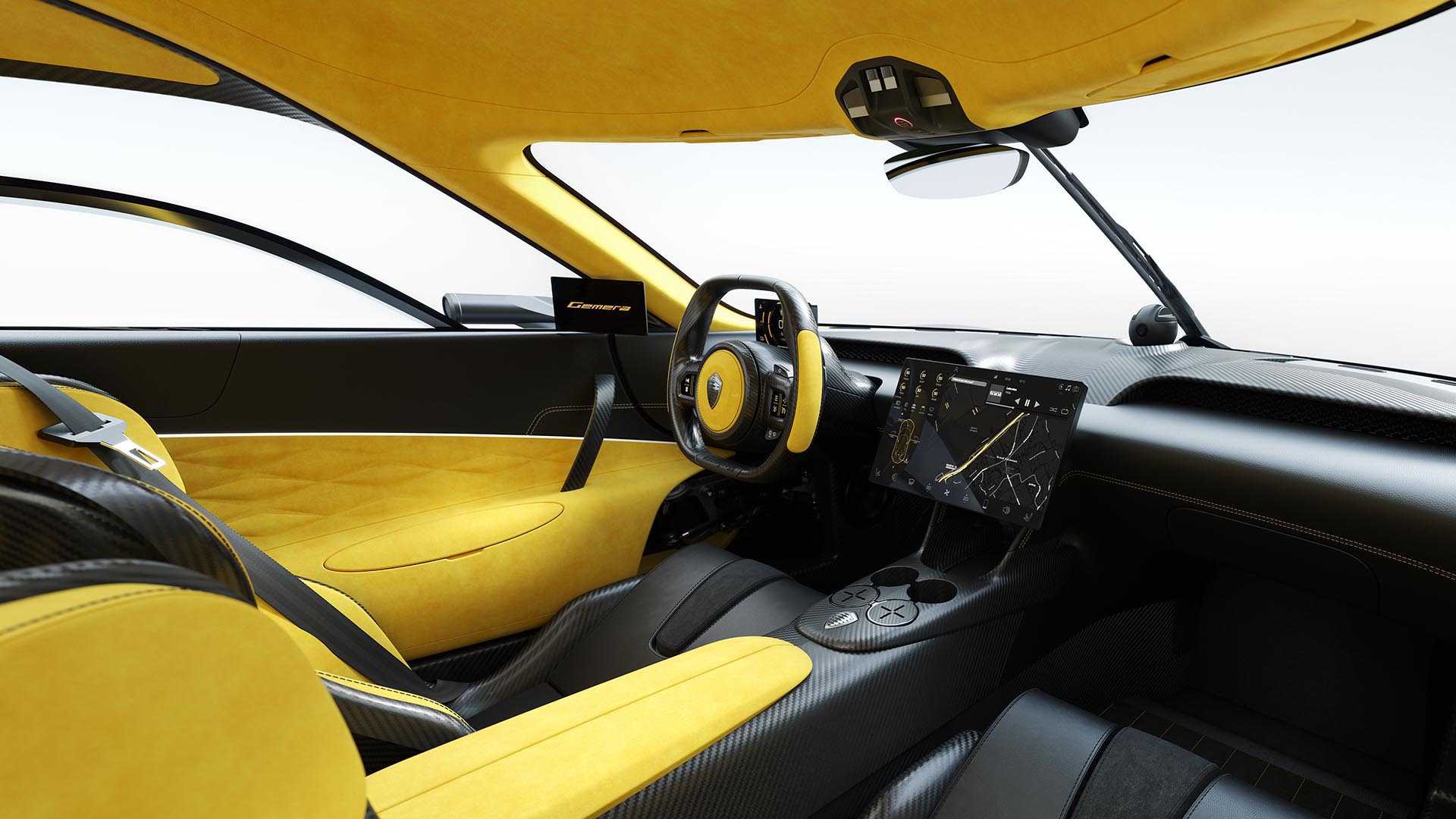 Главной особенностью дизайна Gemera является отсутствие центральной стойки и двух больших двугранных дверей, которые открываются вперед, чтобы облегчить доступ в четырехместную кабину, обитую кожей. В числе удобств четыре подстаканника с подогревом и четыре охлаждаемых подстаканника, системы помощи водителю, четыре сенсорных экрана (два 13-дюймовых центральных сенсорных экрана и два дополнительных экрана для камер бокового и заднего вида), информационно-развлекательная система для передних и задних пассажиров, передних и задние зарядные устройства для беспроводных телефонов, Apple CarPlay, соединение Wi-Fi, трехзонная климатическая система, электрически регулируемые сиденья и аудиосистема премиум-класса с 11 динамиками. При наличии всего 300 единиц производство будет сильно ограничено.