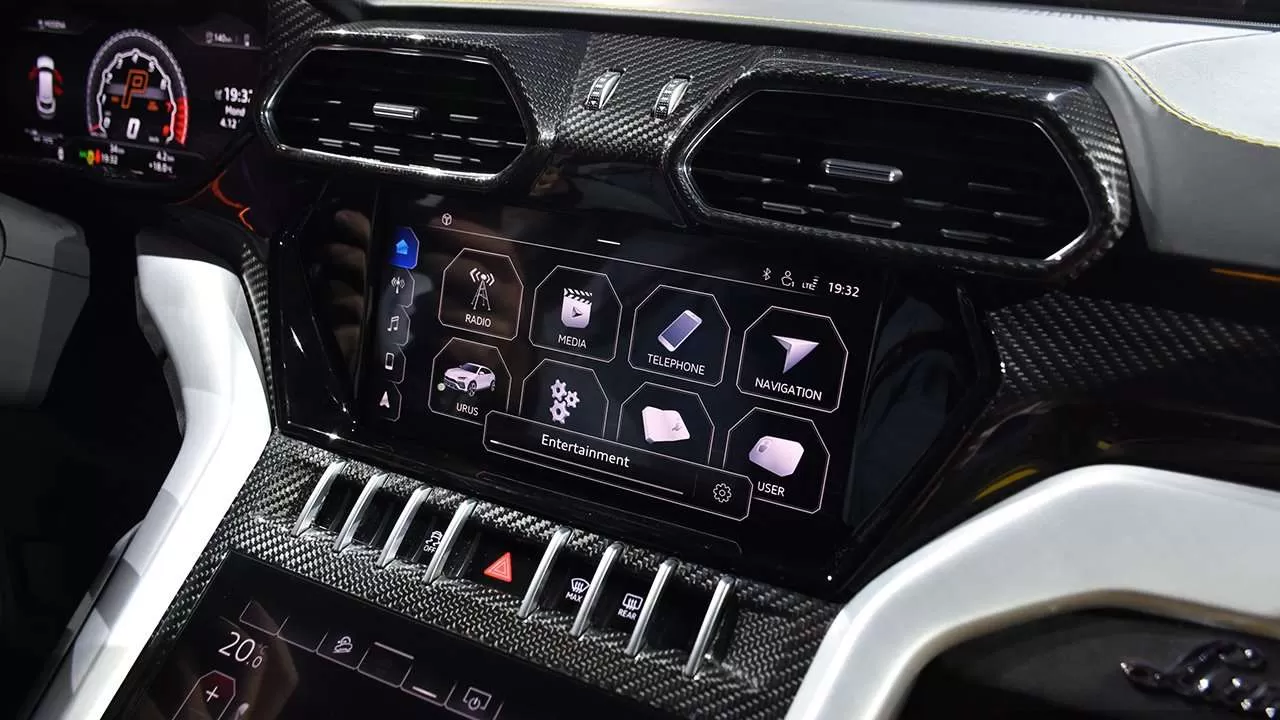 Практически вся панель торпедо выполнена из карбона, верхняя ее часть обшита кожей. Консоль Urus по центру решили особо не нагружать кнопками, а просто установить два TFT-дисплея. Верхний дисплей ответственен за развлекательную систему Lamborghini Infotainment System 3, построенную по принципу мультимедии в новой Ауди А8. Нижний дисплей такой же по диаметру, его функция заключается в настройке климатической системы. Безусловно вся эта система поддерживает интерфейсы Apple CarPlay и Android Auto, при этом присутствует беспроводная зарядка и функция управления голосом.