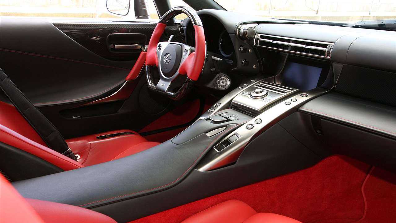 Интерьер Lexus LFA был подчинен функциональности. Здесь царствовал инженерный гений. Практически все затянуто в кожу, спортивный руль эффектно срезан книзу, а сам салон изобилует карбоновыми вставками. При желании можно было купить Lexus lfa с салоном, полностью отделанным кожей или алькантарой, а также в одно- или двухцветном исполнении.