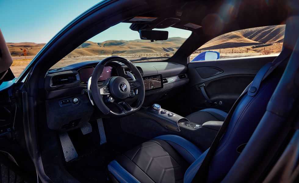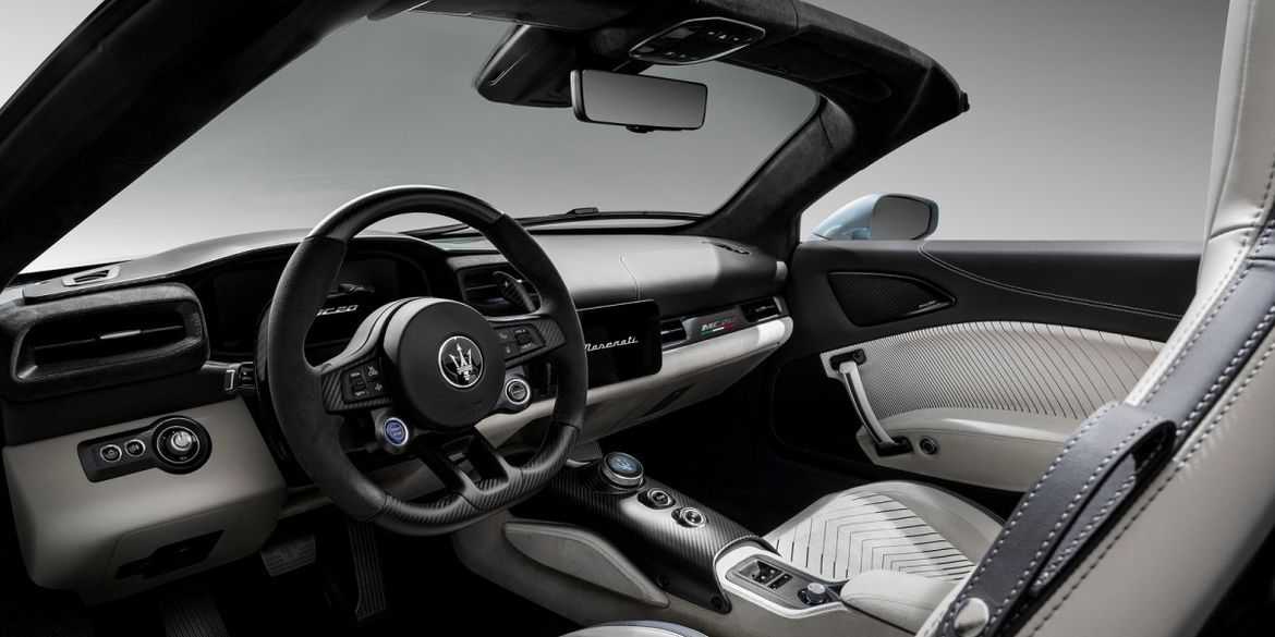 Внутри шкафа MC20; Сиденье водителя обладает функциональностью, как у гоночного автомобиля, но при этом отличается минималистской концепцией дизайна. В кабине есть два экрана, один для водителя, а другой Maserati Touch Control Plus, который расположен напротив водителя на свету. На центральной консоли расположены такие функции, как селектор режимов движения, переключение передач, элементы управления электрическими стеклоподъемниками, управление аудиосистемой информационно-развлекательной системы, функция беспроводной зарядки и планшет для смартфона. Все другие органы управления, включая стартер и Launch Control, объединены в черном кожаном спортивном рулевом колесе, разработанном при участии тест-пилота Maserati Corse и бывшего чемпиона мира MC12 Андреа Бертолини. Рычаги переключения передач также обеспечивают удобство, поскольку они крепятся к рулевой колонке. Камеру заднего вида можно увидеть на экране безрамочного цифрового зеркала заднего вида. Поверхность из углеродного волокна в интерьере снова матовая, чтобы придать ей более оригинальный вид и внешний вид, напоминающий ткань. Два разных багажных отделения MC20 — 47 литров спереди и 101 литр сзади — дополняют функциональность автомобиля.