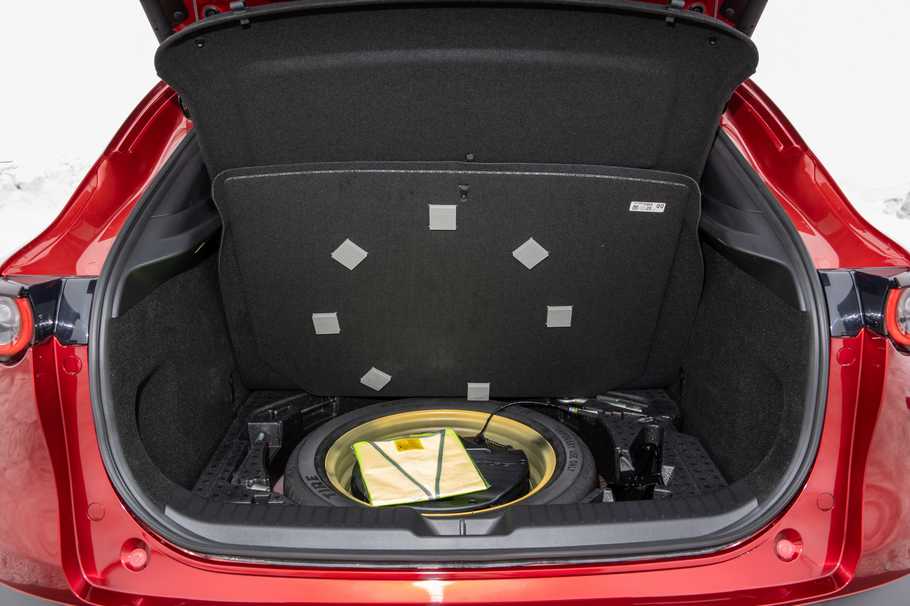 Водительское кресло роскошно по отчетливо выраженному боковому профилю, плотному наполнителю, электронастройкам и памяти положений. Проехали без малого 700 км как на одном дыхании, без спинных судорог. Сзади – комфортабельный диван с откидным подлокотником, дефлекторы вентиляции и скромный запас свободного пространства для 2 пассажиров. Колесная база CX-30 получилась, даже в сравнении с «трешкой», невеликой (2655 мм против 2725 мм), поэтому в коленях «не густо», а если усесться троим, будет и того тяжелее. Все же CX-30 не семейный вариант, у него особый потребитель. Багажник, скажем прямо, невелик, но ожидать от компактного автомобиля пространства Новоафонской пещеры опрометчиво. Стандартный литраж – 295 литров, зато у отсека правильная форма со стенками, обшитыми войлоком, и докатка в полике.