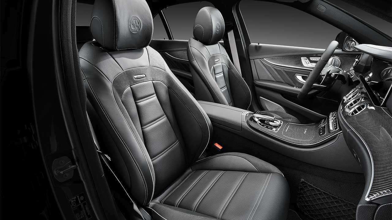 Интерьер автомобиля E 63 AMG S с серийной отделкой кожей наппа выполняется – если для отделки салона выбран чёрный цвет – в сочетании с контрастной серой прострочкой на обивке спортивных сидений AMG, обивке центральных сегментов облицовки дверей, на подлокотниках дверей и центральной консоли. В этом случае ремни безопасности выполняются серебристыми. Уплощённый сверху и снизу обод рулевого колеса AMG Performance отделывается чёрной кожей наппа, а области его захвата отделываются алькантарой (Alcantara) и украшаются контрастной прострочкой серого цвета.