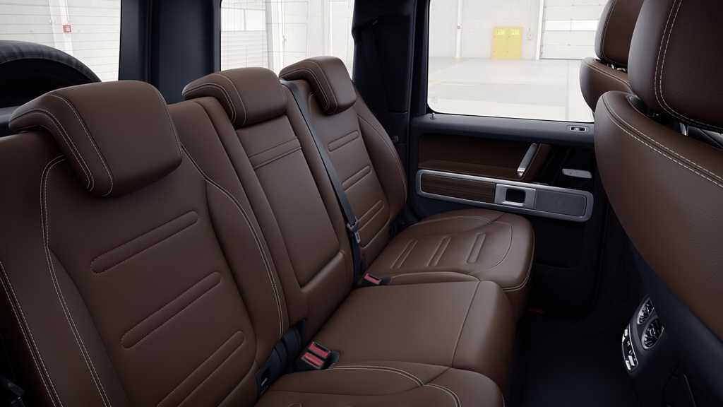 Больше уюта и гостеприимства отныне готовы предложить задние посадочные места Мерседес Гелендваген. Во-первых, пассажиры второго ряда сразу же почувствуют больше свободы за счет того, что расстояние между спинками передних и задних сидений увеличилось на целых 150 мм, а в области плечей появились дополнительные 27 мм запаса. Во-вторых, сам диван стал куда удобнее, он оснащается регулируемыми спинками и центральным подлокотником, за которым скрывается лючок для длинномеров. И, наконец, в-третьих, задние пассажиры получат в пользование персональный пульт управления климатической установкой (трехзонный «климат» доступен не всем версиям) и вместительные карманы на дверях.