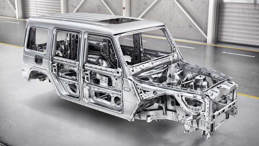 Сопрягаемый с рамой кузов, состоящий в основном из высокопрочных сталей, получил некоторые алюминиевые элементы – это двери, капот и крылья. В результате доработок новый G-Class сбросил со своего изначального веса 170 кг, но при этом сохранил снаряженную массу более двух тонн.