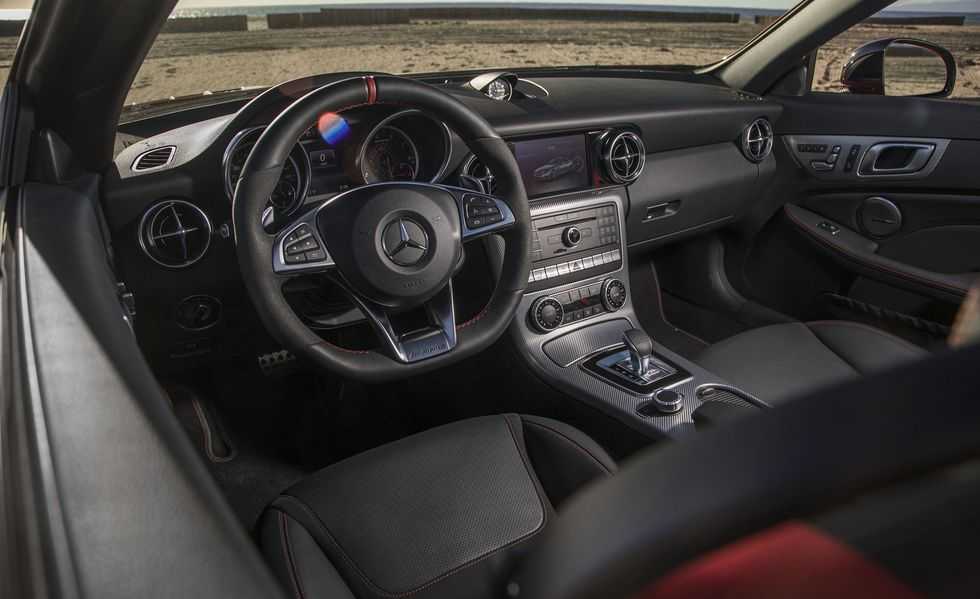 The SLC43’s base trim comes nicely equipped, offering many of the amenities that luxury-car shoppers crave. AMG 18-inch multispoke wheels with black accents keep this car in touch with the pavement. The list of standard exterior features includes automatic projector-beam LED head- and taillights, rear fog lamps, rain-sensing windshield wipers, and heated power-folding sideview mirrors with auto-dimming capability. Inside the cabin, you’ll find heated power-adjustable seats, as well as a power-adjustable tilt-and-telescoping steering column, Wi-Fi hotspot, keyless entry and push-button ignition, dual-zone automatic climate control, and an auto-dimming rearview mirror. When it comes to driver-assistance equipment, blind-spot monitoring is standard.