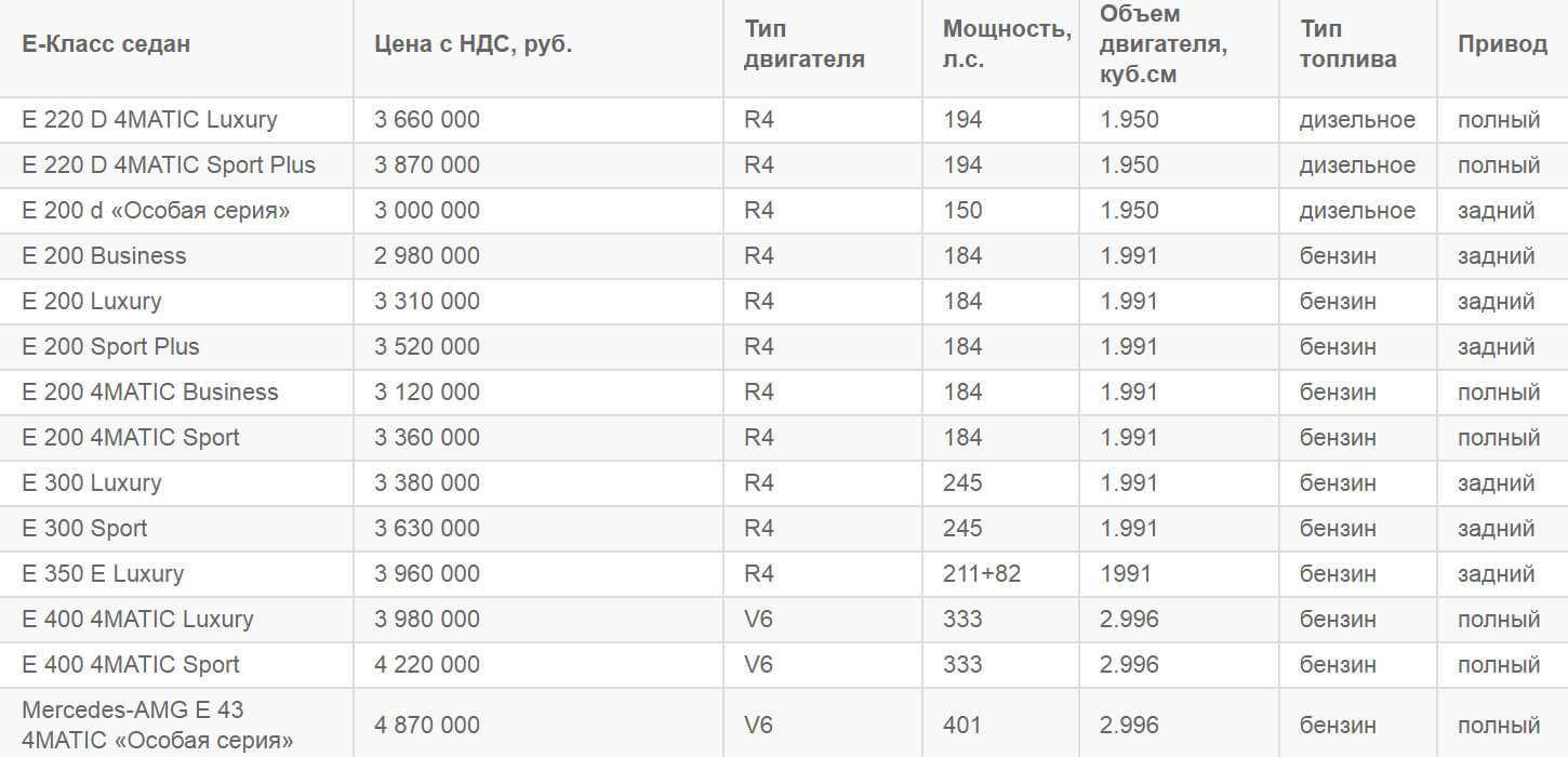 - E 200 D 4MATIC Luxury – от 3 млн. 660 тыс. рублей;