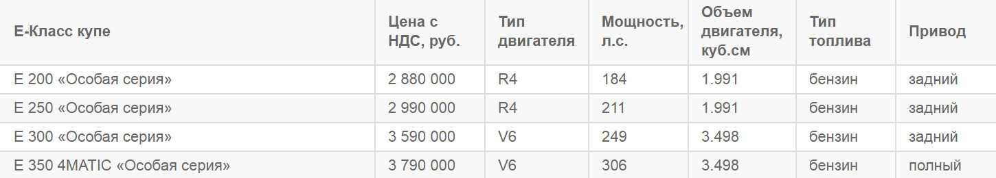 Этот тип автомобилей несколько менее разнообразен, нежели Мерседес Е-класса в корпусе седан. В итоге, купе Мерседес Е-класса имеет исключительно собственные комплектации и соответствующую стоимость.