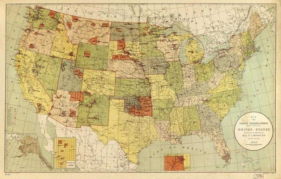 Карта индейских резерваций на 1892 год. К 1900 году в США осталось менее 250 000 индейцев, а только с 1880 года их земли сократились вдвое.