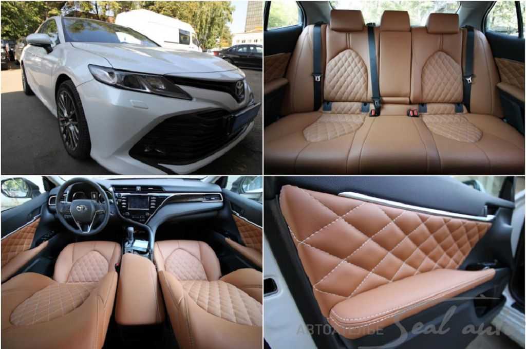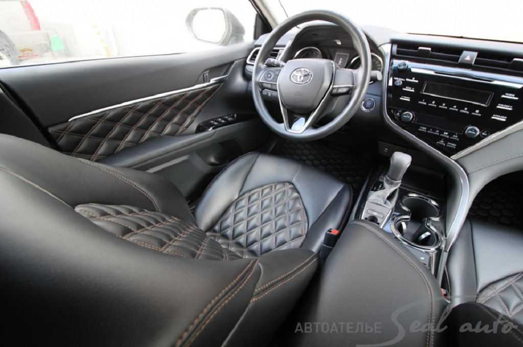 Внутри Тойота Камри 2020 в новом кузове смотрится намного привлекательнее, чем раньше. В первую очередь, благодаря уникальной передней панели, получившей дисплей системы мультимедиа с диагональю 8 дюймов и управляющий блок климатической установки. Рабочее пространство водителя отличается повышенной эргономикой, а для удобства связи автомобиль получил возможность выхода в интернет (со скоростью по стандарту 4G) и синхронизацию с бортовой системой сразу 5 смартфонов.
