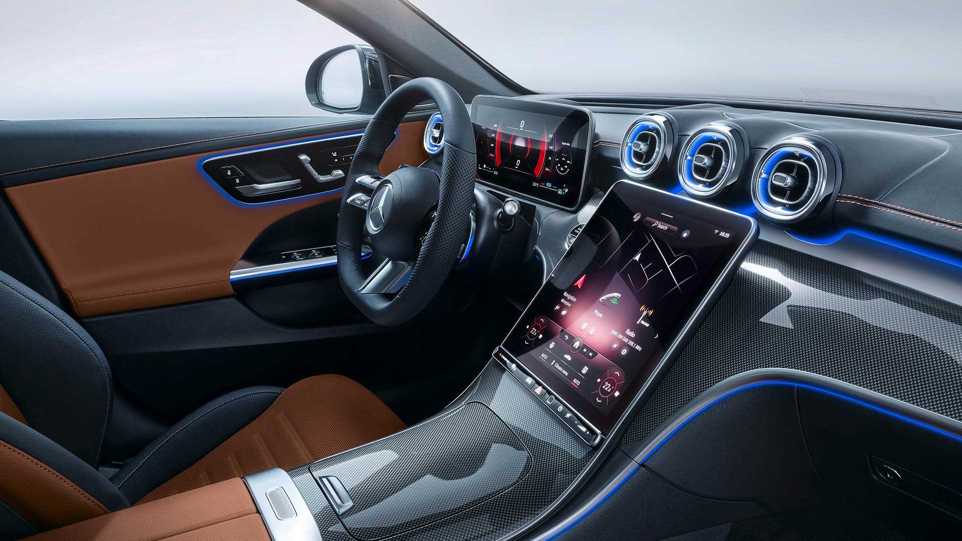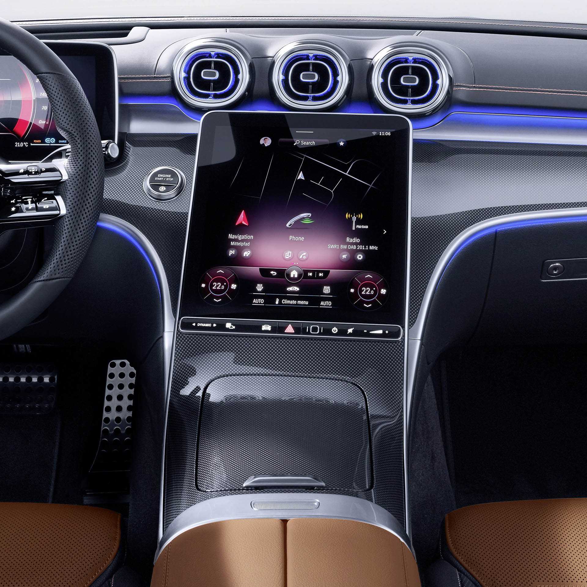 Вслед за флагманом, C-Class получил новую мультимедиа MBUX второго поколения, которая обновляется по воздуху. Она стала центром всего автомобиля. По желанию покупателя приборная панель может быть двух диагоналей: 10,25 или 12,3 дюйма. Центральный вертикальный экран — 9,5 или 11,9 дюйма. Есть опциональный проекционный дисплей и система дополненной реальности.