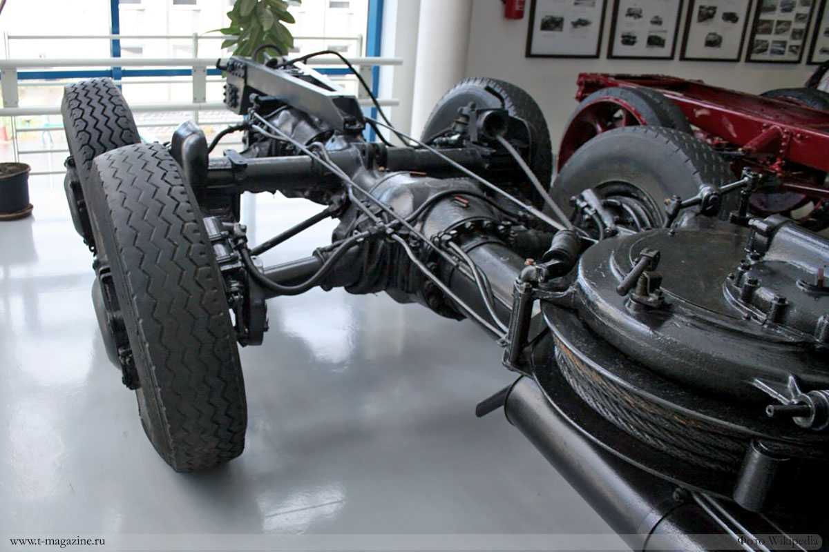 Передняя и задние оси – ведущие, с качающимися полуосями. Передний мост отключаемый. Ведомые шестерни и сателлиты, передающие крутящий момент от дифференциала, располагаются в картере моста. Сам дифференциал – цилиндрического типа – размещён в несущей хребтовой трубе.