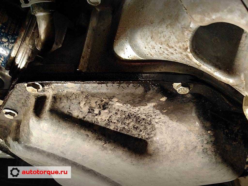наличие подтеков масла, особенно поддон и переднюю крышку двигателя (крышка