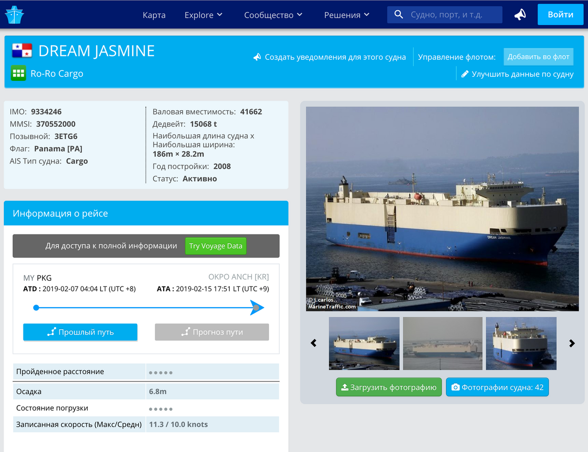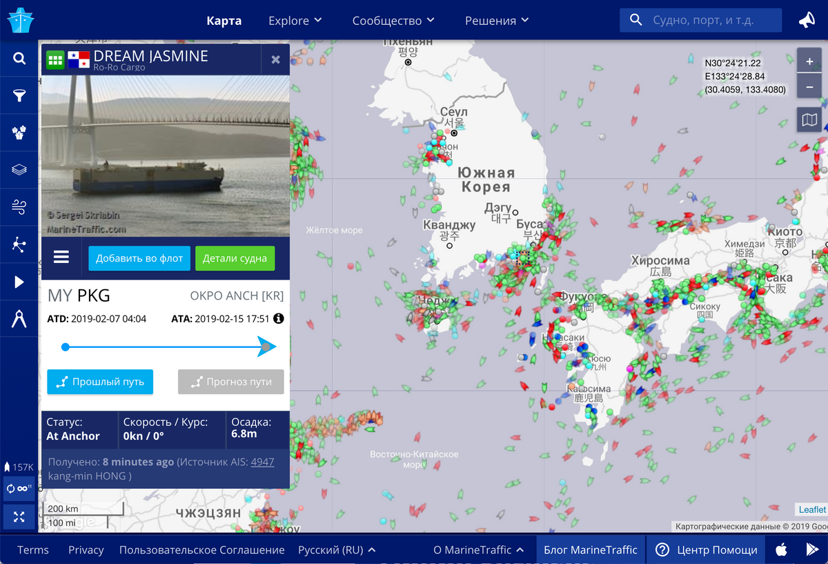 Также можно определить текущее положение и направление судна. Например, на момент верстки этой статьи судно двигалось из Японии в сторону Китая