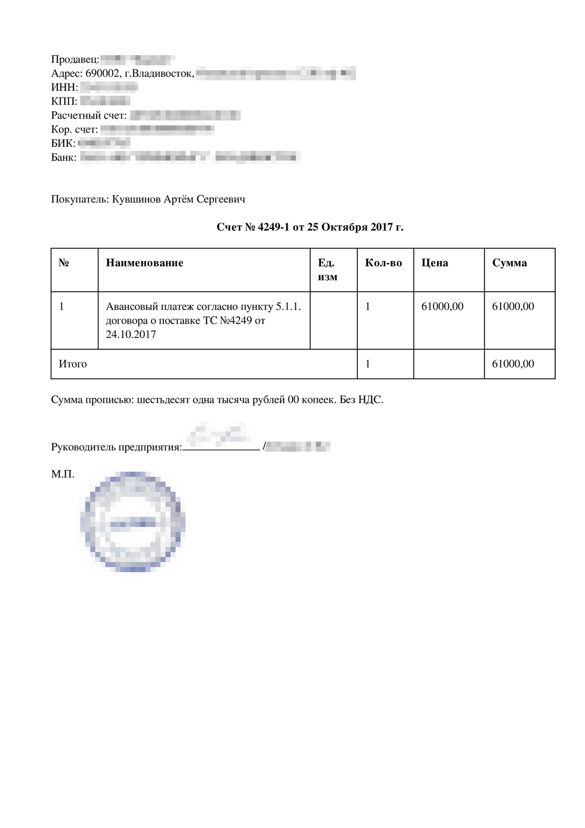 В частности, меня смущала туманная формулировка в счете: «Оплата авто по договору такому-то». Ссылка на договор — это хорошо, но непонятно, что именно я оплачиваю. Я настоял на более детальном описании со ссылкой на конкретный пункт договора.