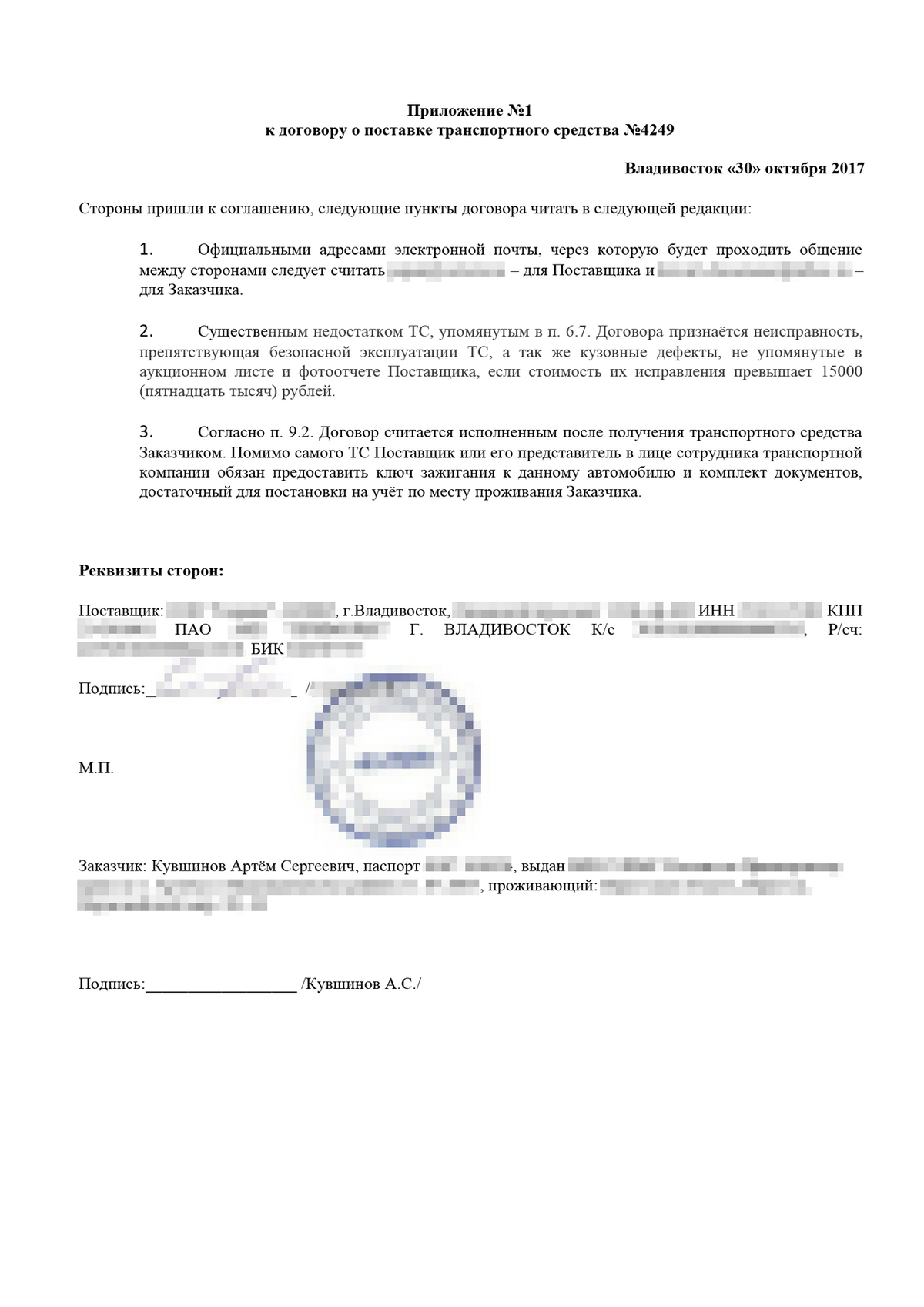 Для меня было важно зафиксировать официальные каналы связи и список вещей и документов, которые я должен получить вместе с авто. Еще я внес пояснение: что будет считаться существенным недостатком авто, который посредник обязуется исправить за свой счет