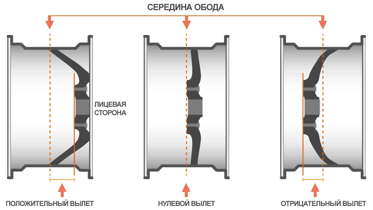 Получается, если вылет больше, то ступичная часть сильнее «выпирает» наружу. В случае установки диска с большим вылетом ЕТ обод будет глубже заходить в колесную арку. Простыми словами, чем больше вылет (положительный), тем сильнее колесо «утоплено» в арку. При этом чем меньше вылет диска (отрицательный), тем сильнее само колесо выступает наружу.