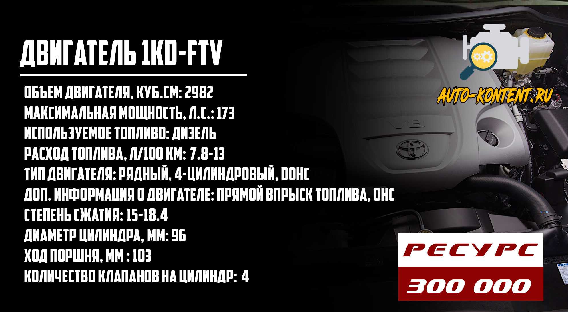 - 1KD-FTV. Это трехлитровый дизель на 173 л.с. агрегируется с автоматом. С 2013 года дополнительно получил фазорегулятор VVT-i;