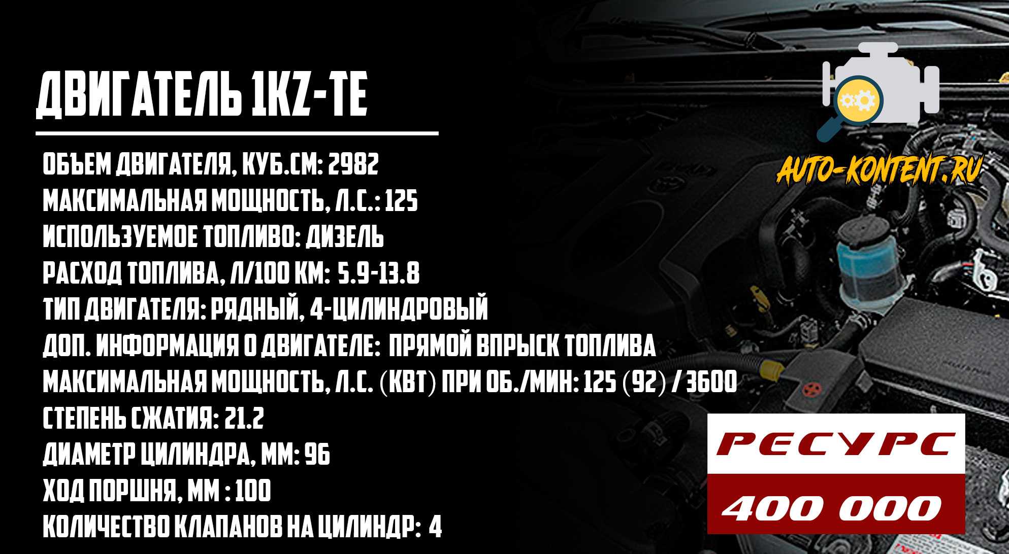 - 1KZ-TE. Конструктивно простой четырехцилиндровый ДВС с 8-клапанной ГБЦ. Оснащен ТНВД механического типа;