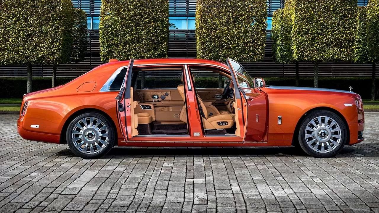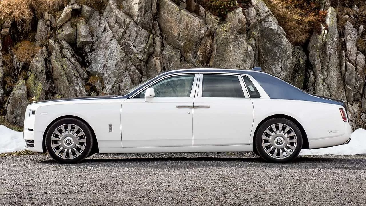Роскошный образ Phantom 2022-2023 продолжается сбоку, здесь нет каких-то агрессивных форм, все отдано в пользу плавности, создающей представительный образ. Отсюда видны огромные размеры, которые кстати стали меньше. По слухам, причина в китайском рынке, куда уходят основные продажи. Ручки обеих дверей соединены, потому что задняя дверь открывается иначе.
