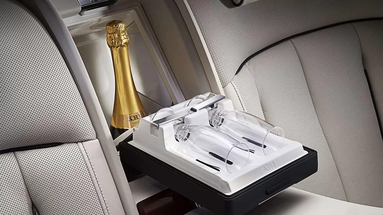 Из фирменных фишек остался дорогой вытаскиваемый зонт. Из относительно привычных элементов есть холодильник с фужером для шампанского и выдвижные электроприводом столики.