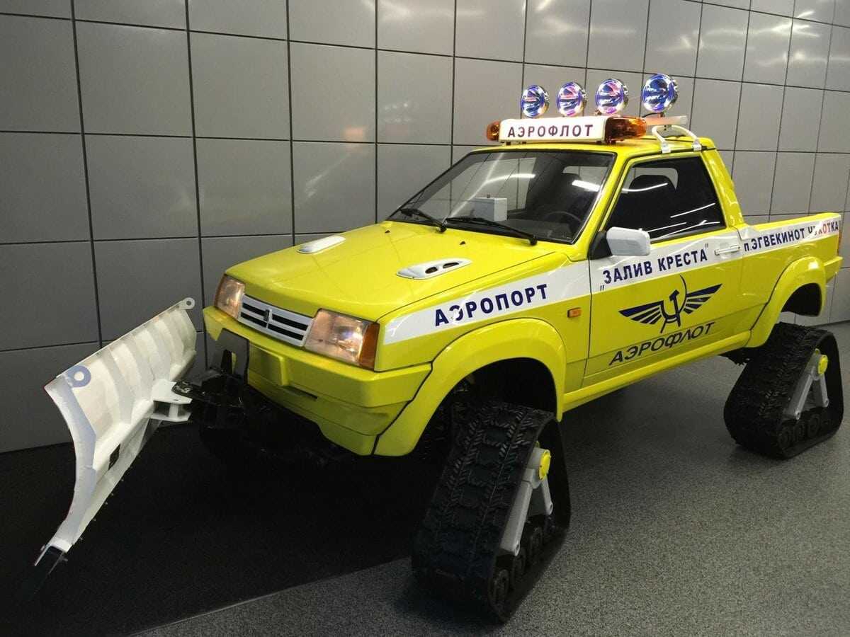 Изначально партия таких пикапов была выпущена для рабочих в дорожной службе Саратовской области. Но совсем недавно одну машину нашли и отреставрировали “на свой вкус”. Так пикап получил желтую окраску, гусеницы и надпись “Аэрофлот”. Посвятили модель юбилею Аэрофлота и выставили на всеобщее обозрение.