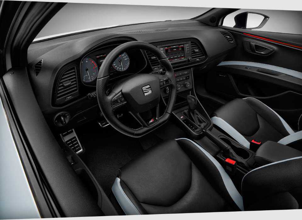 В салоне тоже переделок немного. У Cupra 2014 заменили рулевое колесо, установили вместо штатного руль спортивного типа. Передняя панель осталась без изменений. Та же приборная доска, центральная консоль, немного повернутая в сторону водителя, располагает в себе дисплей мультимедийно-навигационной системы и климат-системы.